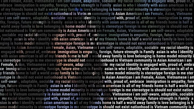 Taking these answers and self-images provided by the individuals, the Processing program creates personalized typographic portraits through a pixel manipulation algorithm. The portraits undergo a fluxing animation sequence inspired by the Gestalt principles, before turning indecipherable. The screen then prints "ASIAN AMERICA", which explodes and disperses into infinitesimal particles. The program then repeats the process with the next portrait.
